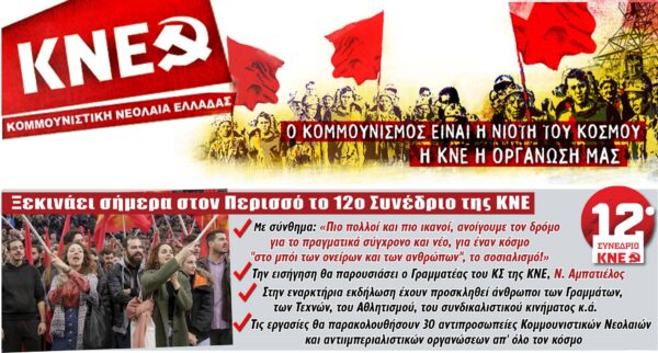 Αρχίζει , σε κλίμα ΕΝΘΟΥΣΙΑΣΜΟΥ και ΑΙΣΙΟΔΟΞΙΑΣ, μετά από πολύμηνη προετοιμασία το 12ο ΣΥΝΕΔΡΙΟ της ΚΝΕ με θέσεις, που προβάλουν και αντιμετωπίζουν μέσα από δυναμικές λύσεις όλα τα σύγχρονα προβλήματα της νεολαίας