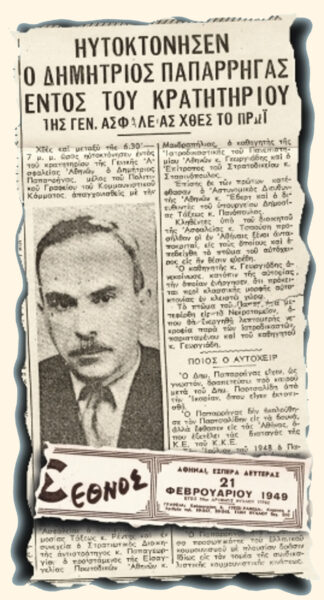 1949 Δολοφονήθηκε από την Ασφάλεια Αθηνών ο Δημήτρης (Μήτσος) Παπαρήγας (γεννήθηκε το 1896) συνδικαλιστής, γραμματέας της ΓΣΕΕ, ηγετικό στέλεχος του ΣΕΚΕ και του ΚΚΕ. το 1949. Ο πατέρας του ήταν φτωχός επαγγελματίας και δύσκολα κατόρθωνε να ζει την οικογένεια με τα πέντε παιδιά του. Σε ηλικία 14 χρονών έγινε σιδεράς και στο οργανωμένο μαζικό κίνημα μπαίνει το 1919, όταν γίνεται μέλος του Σωματείου Μεταλλεργατών Βόλου. Πήρε μέρος στα «επιστρατικά» του Βόλου, ένα κίνημα που εξέφραζε τις αντιπολεμικές διαθέσεις των στρατιωτών και αργότερα, όταν υπηρετούσε τη θητεία του στο ναυτικό, μοίραζε αντιπολεμικές – σοσιαλιστικές προκηρύξεις που προμηθευόταν από το τμήμα του ΣΕΚΕ στο Βόλο. Τότε εντάσσεται στο ΣΕΚΕ. Το 1921 στέλνεται στο μέτωπο της Μικράς Ασίας, όπου οργανώνεται σε αντιπολεμικούς πυρήνες. Το 1922, όταν επιστρέφει στο Βόλο μετά τη Μικρασιατική Καταστροφή, οργανώνει το κίνημα των Παλαιών Πολεμιστών στη Μαγνησία και γίνεται γραμματέας του Συλλόγου “Παλαιών Πολεμιστών και Θυμάτων Στρατού” στο Βόλο.