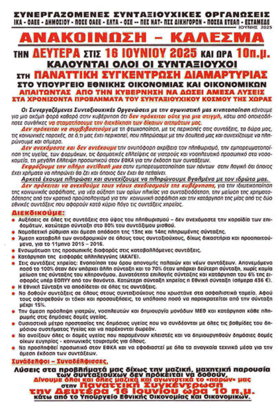 Παναττική συγκέντρωση, διεκδικώντας άμεσα μέτρα για τα οξυμένα προβλήματα των συνταξιούχων, πραγματοποιούν σήμερα Δευτέρα 16 Ιούνη οι Συνεργαζόμενες Συνταξιουχικές Οργανώσεις.