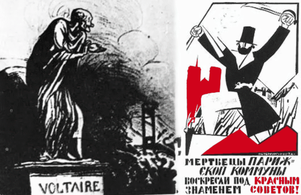 Προς άρση τυχόν αποριών για τη σχετικότητα της φωτογραφίας: δύο σοβιετικές αφίσες του Δεκ-1921 _η γκιλοτίνα καίγεται από τους κομμουνάρους, κάτω από τα χειροκροτήματα του Βολταίρου και οι Μπολσεβίκοι πήραν την κληρονομιά τους από την Παρισινή Κομμούνα, όπως εμφανίζεται με το τίτλο “οι μάρτυρες της Παρισινής Κομμούνας αναστήθηκαν κάτω από το κόκκινο έμβλημα των Σοβιετικών”