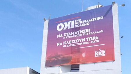 Γιγαντοπανό στον Περισσό: «Όχι στον ιμπεριαλιστικό πόλεμο – Να σταματήσει η συμμετοχή της Ελλάδας»