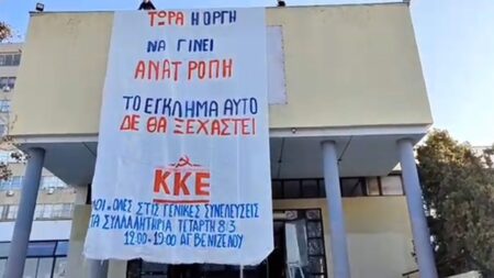 #τεμπη_εγκλημα: Γιγαντοπανό του ΚΚΕ και της ΚΝΕ στο ΑΠΘ με σύνθημα «Το έγκλημα αυτό δεν θα ξεχαστεί»