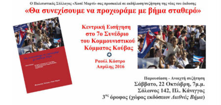 Εκδήλωση-παρουσίαση της έκδοσης: “Θα συνεχίσουμε να προχωράμε με βήμα σταθερό”, Ραούλ Κάστρο (22/10)