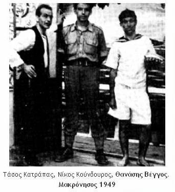 «Έφεραν τον Θανάση Βέγγο στη Μακρόνησο τον Μάρτη του 1949. Ήταν νευρικός, αεικίνητος, αγχώδης με όλα. Ήταν όμως και καρτερικός και βοηθούσε. Το λιγότερο που φοβήθηκε ήταν η Μακρόνησος. Πιο πολύ φοβόταν τη σκόνη, όχι τα μικρόβια. Στα μακαρόνια μέσα έκοβε ένα κρεμμύδι κι έτρωγε ό,τι περίσσευε από την καραβάνα του άλλου χωρίς να σιχαίνεται. Αλλά δεν μπορούσε να ανεχτεί τη σκόνη. Και την αταξία. Έτυχε να κοιμόμαστε στο ίδιο τσαντίρι. Το καλοκαίρι έκανε αφόρητη ζέστη, οι σκηνές πύρωναν κι έτσι ανεβάζαμε τα πλαϊνά παραπέτα να μπει λίγος αέρας. Μαζί με τον αέρα όμως έμπαινε και σκόνη. Ο Θανάσης δεν μπορούσε να την υποφέρει. Μόλις γλαρώναμε, πήγαινε και τα ‘κλεινε.