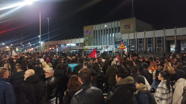 Με συνθήματα και πανό περικύκλωσαν τον σταθμό του ΟΣΕ οι διαδηλωτές στο νέο μεγάλο συλλαλητήριο των εργατικών σωματείων στη Θεσσαλονίκη.